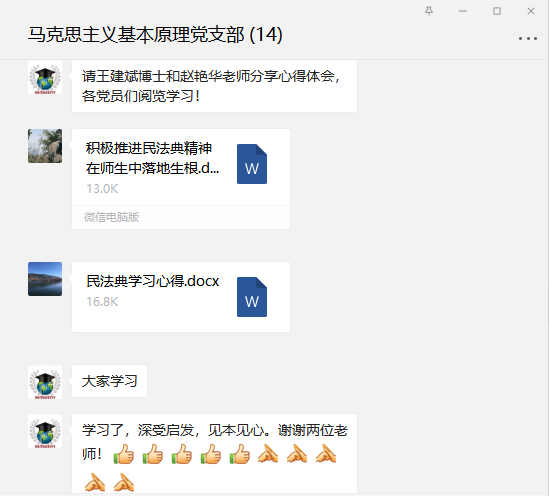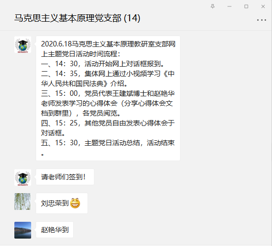 2020年6月18日下午两点半,h小说 马克思主义基本原理概论教研室支部在微信支部群中开展了《中华人民共和国民法典》学习讨论主题党日活动,马克思主义基本原理概论教研室党支部全体党员参加会议