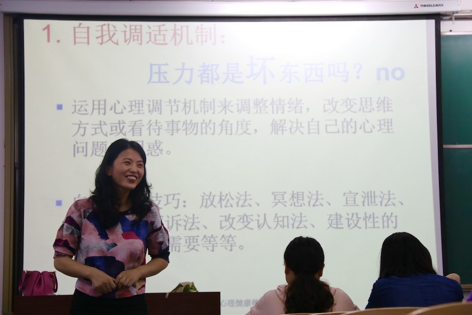 基于上述结论,刘洪老师为大家提供了三个应对心理亚健康的方法:自知、自助、助人。在自知方面,刘老师建议在座同学进行反思,并应在遇到问题时进行心理检测,校友会堂设有心理咨询室,有需要的同学可携带学生证等证件进行免费检测;在自助方面,通过刘老师提供的相关测试题,检测出在座某些同学存在心理压力大的情况。针对此情况,刘洪老师着重提出:心理调节的核心内容是善待压力,并为在座同学提供两种主要的调节机制:自我调节与社会调节。在自我调节方面,刘洪老师提醒到:适当的压力可以激发潜能,希望在座同学通过相应的技巧去调节;关于社会调节方面,则建议同学们在遇到问题的时候去寻找专业机构进行咨询。此外,在助人方面,刘洪老师希望大家发扬互帮互助的精神,关心身边同学的状态,班级的心理委员应积极承担责任,配合学校落实相关工作。