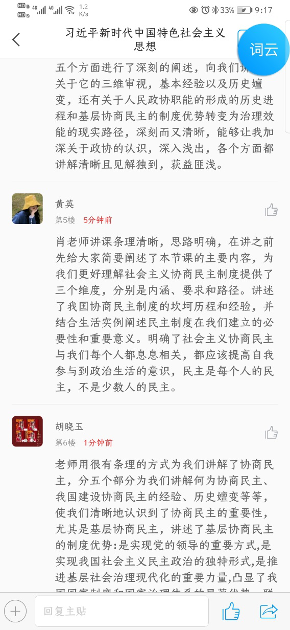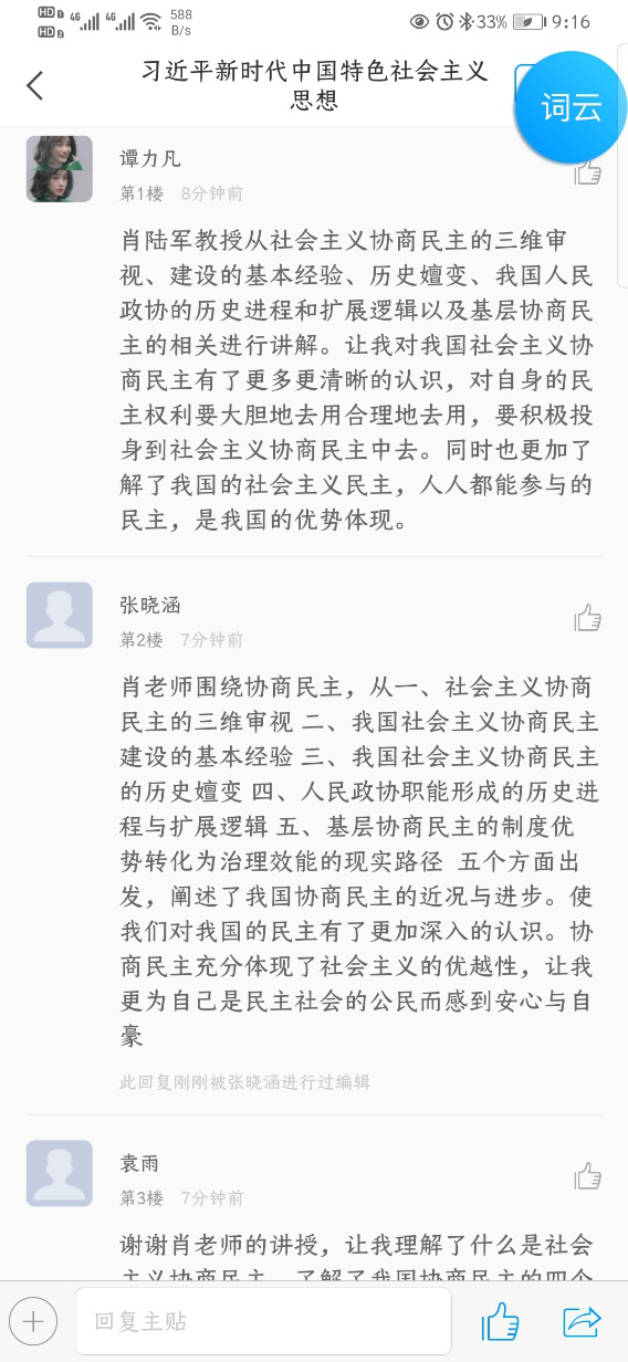 通过本次课程,同学们更加明确了社会主义协商民主的内涵,对自身的民主权利有了更多更深刻的认识,了解了我国的社会主义民主是协商民主和选举民主的有机结合。本次讲课,肖教授备课充分,PPT制作简洁明了,课堂气氛活跃,深受同学们欢迎。课后,同学们纷纷在网络平台上表达自己的学习心得。