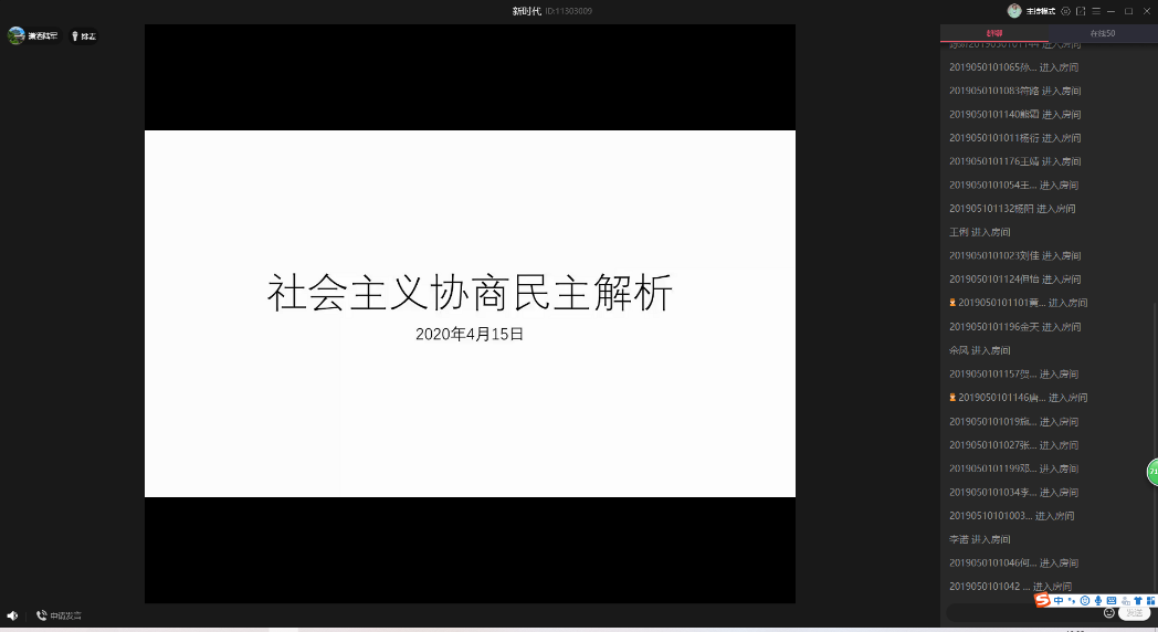 肖陆军教授主讲,讲课主题为“画出最大同心圆:社会主义协商民主在路上”。本次授课采用了QQ群课堂直播的线上教学形式,选课同学按时、全部参与了此次线上教学活动。