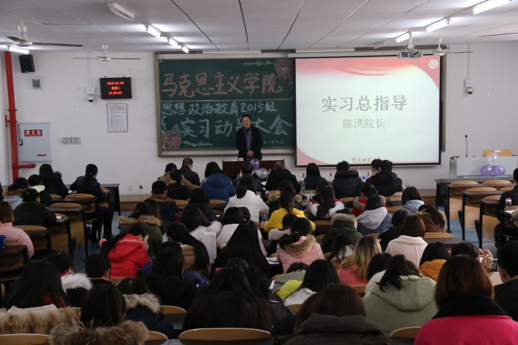 思想政治教育专业2015级实习动员大会在砺志楼2208教室隆重召开。院长陈洪、副院长况明安,实习实训室主任郑瑜、副主任吴涯,以及所有实习指导教师、教科办主任、2015级辅导员和2015级全体同学出席了动员会。