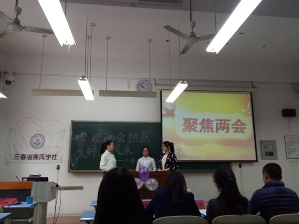三春湖廉风学社于2016年3月17日于弘德楼2203教室开展“观两会热点 展时代风采”主题的时政热评比赛。出席本次活动的嘉宾有新媒体部副部刘娇、女生部副部长张诚智宇、社团部副部长李玉林。三春湖廉风学社全体成员参加本次活动。