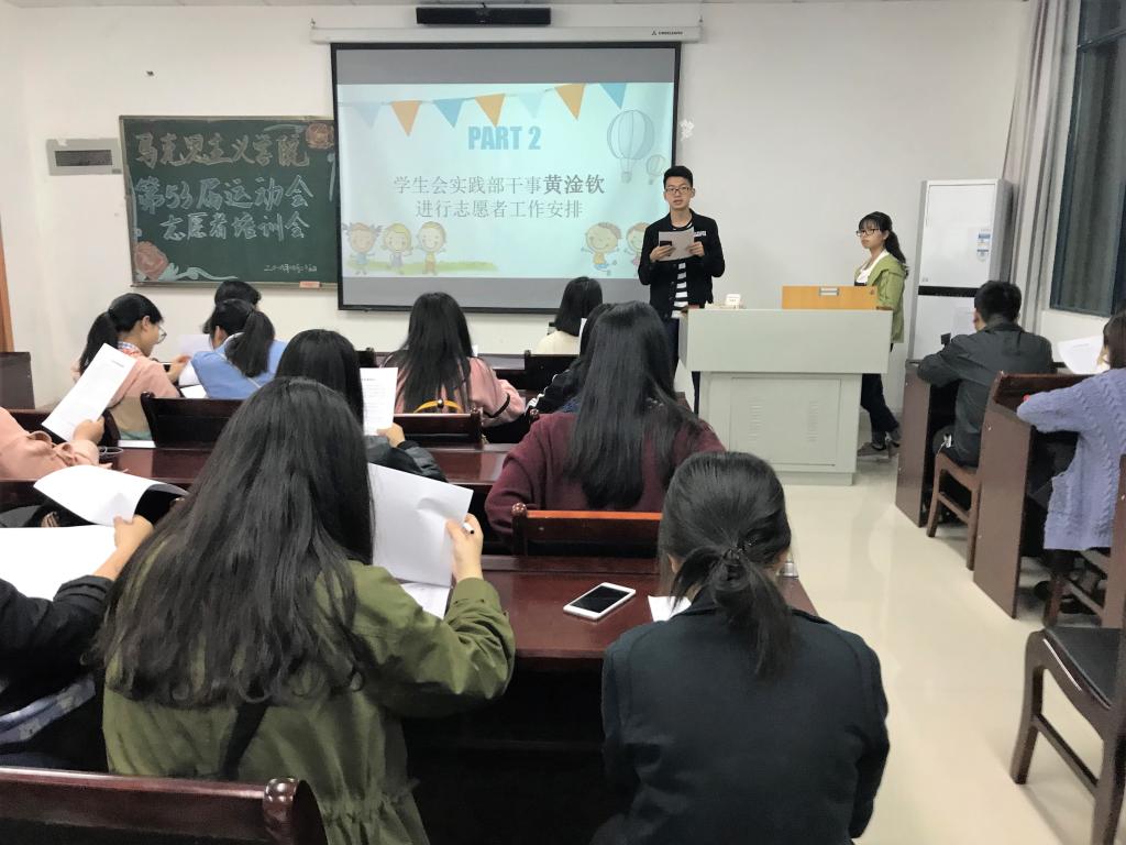 团总支·学生会实践部特在汇贤楼201教室举办第53届运动会志愿者培训大会。出席本次大会的嘉宾有实践部志愿者分队队长陈寒、副部李红林、干事林燕、黄淦钦、黄一耕。2017级志愿者成员积极参与。