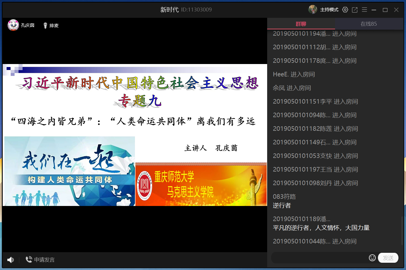 孔庆茵副教授主讲,讲课主题为“四海之内皆兄弟”:“人类命运共同体”离我们有多遥远。本次授课采用了QQ群课堂的线上教学形式,选课同学按时参与了此次线上教学活动。