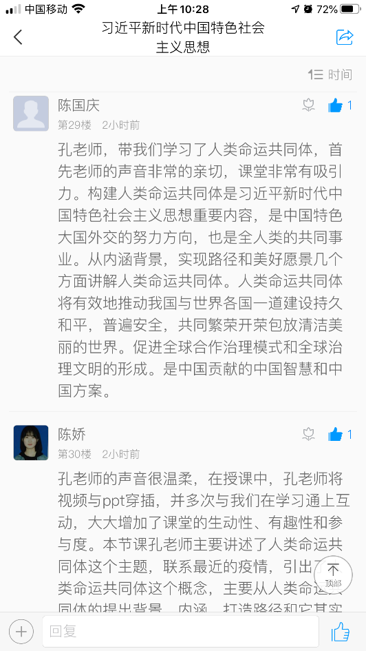 通过本次课程,学生们对“人类命运共同体”有了更深的了解,有利于培养国际视野,并且有利于促进同学之间、师生之间和谐相处。本次讲课,孔老师备课充分,制作精美的PPT与视频相结合,课堂气氛活跃,讲课语言诙谐有趣、慷慨激昂,深受同学们欢迎。课后,同学们纷纷在网络平台上表达自己的看法。