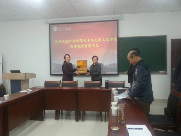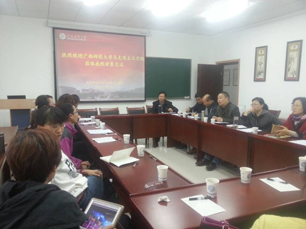 2015年11月16日下午,广西师范大学h小说 由副院长韦冬雪博士带队,一行十人到h小说 交流考察。h小说 全体领导班子以及学科负责人、思想政治理论部负责人等十余人一起参加了交流。双方就学科建设、思想政治课改革以及青年教师科研水平的提升等方面进行了交流学习,整个交流互动性强,激烈而活跃,气氛融洽而和谐,不仅增进了了两院之间的友谊,而且开拓了学科视野、激活了改革思路等。