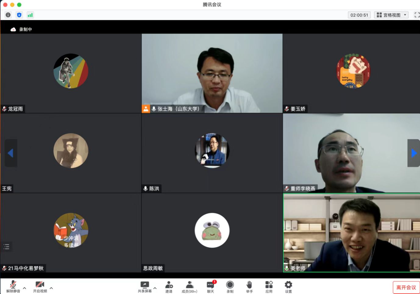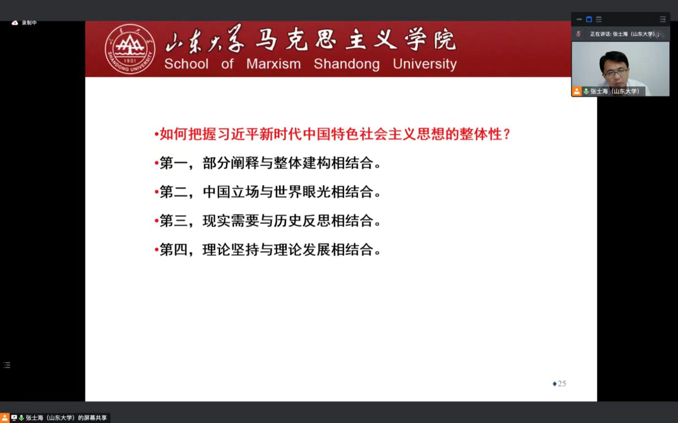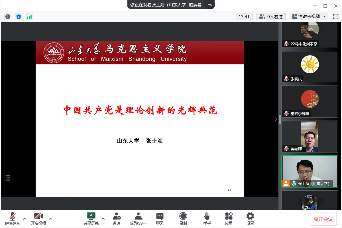 为进一步深入学习宣传贯彻党的二十大精神,202211101930,山东大学h小说 院长、博导张士海教授应邀为h小说 师生作了题为中国共产党是理论创新的光辉典范的主题讲座。本次讲座系h小说 马克思主义论坛(第9期)暨h小说 26届研究生学术活动月系列活动。讲座由h小说 副院长姜土生教授主持,h小说 近300名师生通过腾讯会议线上参会学习。