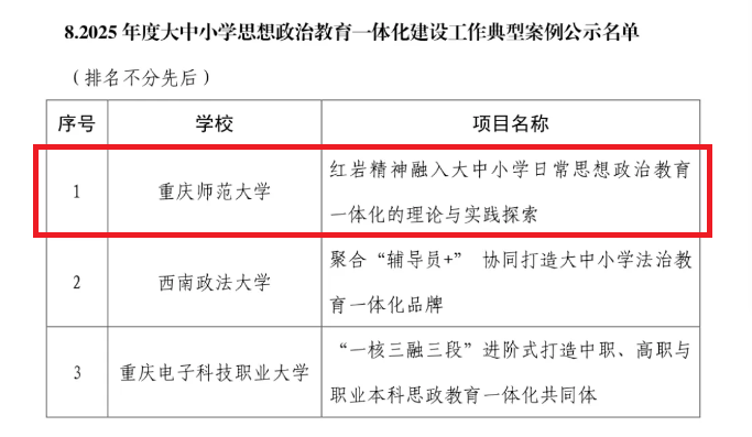 姜土生院长组织申报的“红岩精神融入大中小学思想政治教育一体化的理论与实践探索”项目,入选大中小学思想政治教育一体化建设工作典型案例。