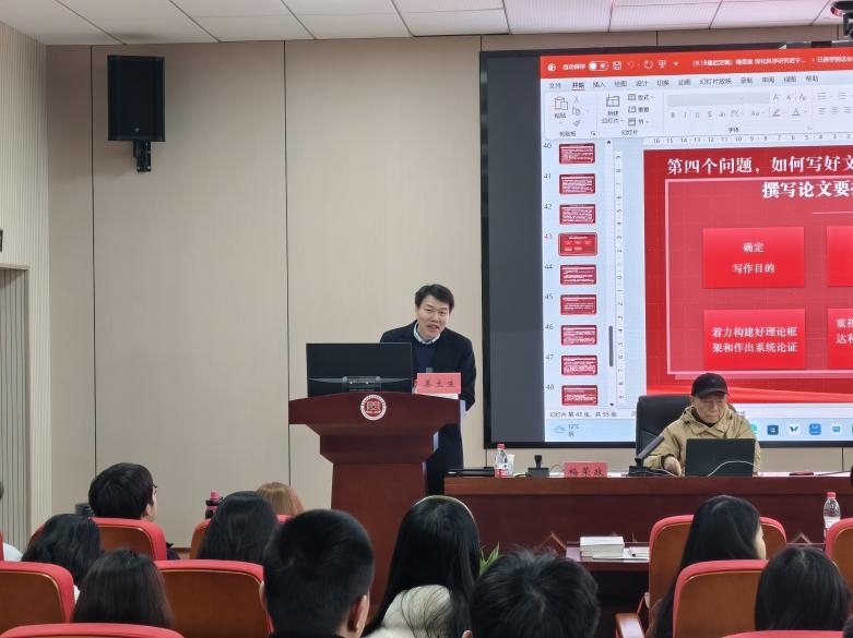 讲座最后,梅荣政教授总结道:写作水平的精进并非一蹴而就,其根本之道在于持之以恒地多读多写。一方面,要坚持研读权威期刊与经典原著,在长期积累中夯实理论基础;另一方面,要坚持多写多练、勤于动笔,在反复打磨与实战训练中锤炼写作本领,以读促写、以写固学,稳步提升综合写作素养。