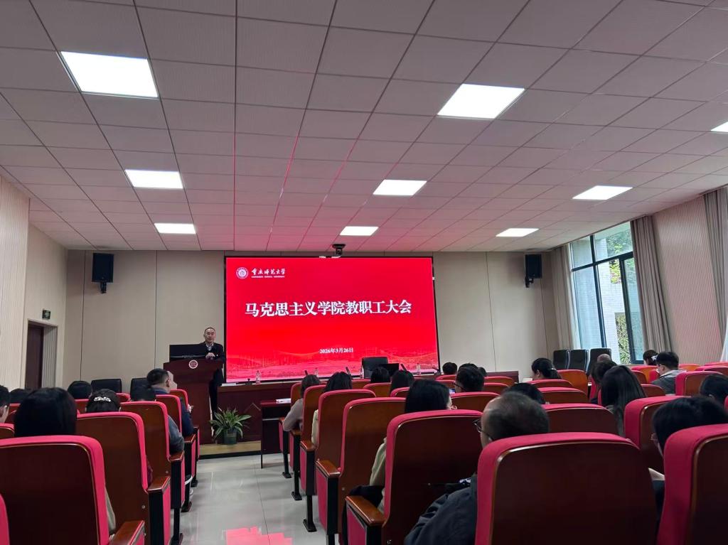 全国优秀教师、校师德标兵兰桂萍教授从2026年全国两会概况、2026年政府工作报告解读、两会精神进思政课堂三个方面作题为《蓝图绘就千重锦•号角催征万里程-学习贯彻2026年全国两会精神》的讲授学习。她强调:政府工作报告聚焦高质量发展、民生福祉保障等重大部署,既是国家发展“施工图”,更是思政课“活教材”,把两会精神有机融入课堂,促进思政课堂和社会课堂有效融合,讲透理论逻辑,讲清发展成就,讲好时代使命,是思政课教师的责任和使命。