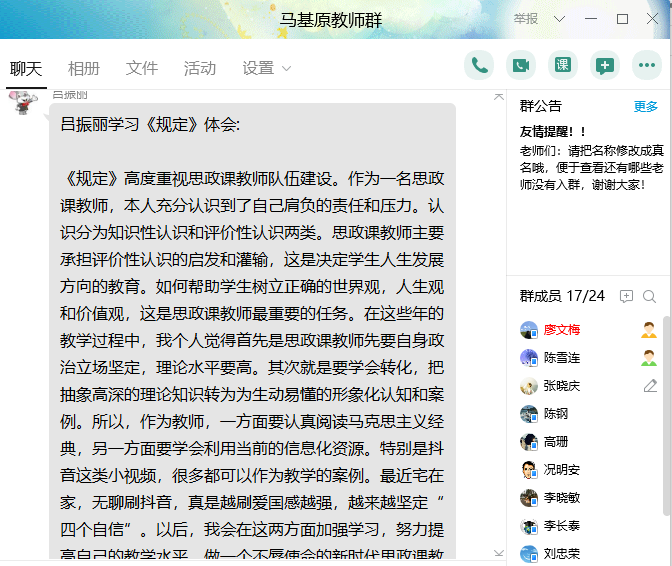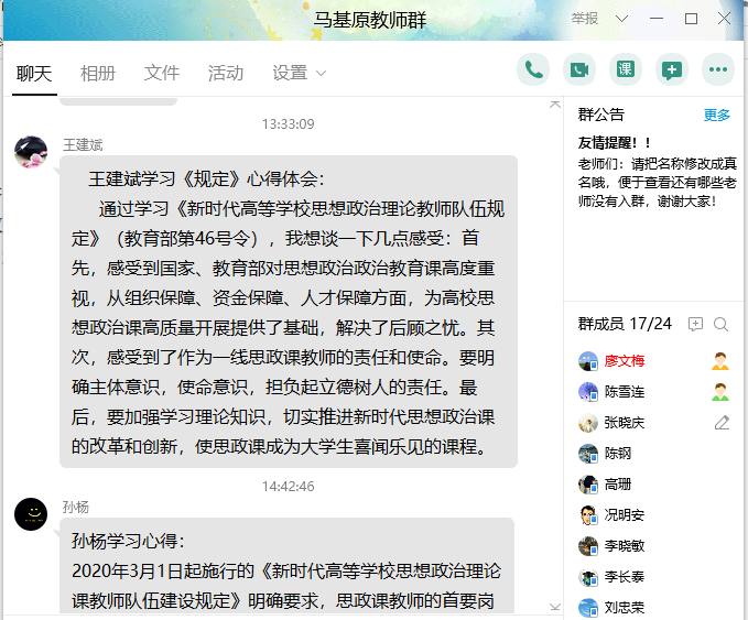 三是扎实开展学习讨论。2020318日,时值习近平总书记在学校思想政治理论课教师座谈会上发表重要讲话一周年,我校h小说 组织全体教师,以教研室为单位,通过钉钉视频会议方式,重温了习近平总书记“318”重要讲话,认真开展了《规定》的学习讨论。大家认为,思政课教师赶上了最好的时代,迎来了历史上最好的时期,党和国家对高校h小说 建设和思想政治理论课给予了前所未有的支持,对思政课教师给予了前所未有的关注和关爱。通过学习习近平总书记“318”重要讲话和教育部的《规定》,大家备受鼓舞和鞭策,又深感使命光荣、责任重大,大家纷纷表示,一定不能辜负党和国家对思政课教师的希望,要按照习近平总书记提出的“政治要强、情怀要深、思维要新、视野要广、自律要严、人格要正”的教诲严格要求自己,把讲好思政课作为思政课教师的首要岗位职责,严格按照“八个相统一”深化教学改革创新,全身心进行教书育人,引导学生立德成人、立志成才,树立正确世界观、人生观、价值观,坚定对马克思主义的信仰,坚定对社会主义和共产主义的信念,增强中国特色社会主义道路自信、理论自信、制度自信、文化自信,厚植爱国主义情怀,把爱国情、强国志、报国行自觉融入坚持和发展中国特色社会主义事业、建设社会主义现代化强国、实现中华民族伟大复兴的奋斗之中,为培养德智体美劳全面发展的社会主义建设者和接班人作出积极贡献,努力争做“四有”好老师,做一名新时代合格的思政课教师。
