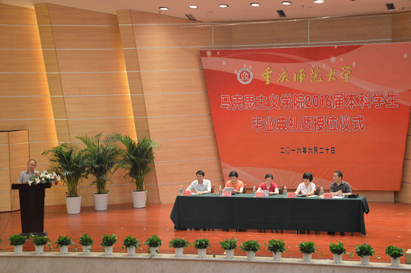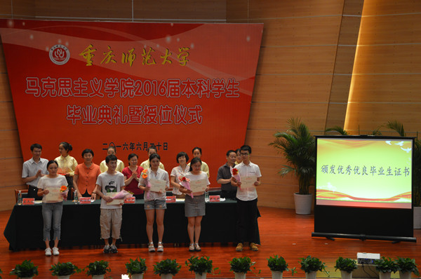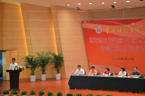 首先,毕业典礼在一段精美的毕业视频中拉开了序幕。在全体师生演唱了庄严的国歌之后,吴晓燕院长发表了一段深切的讲话。她在讲话中表示了对全体本科毕业生的祝贺,并肯定了本届毕业生在个人和团体中取得的各项骄人成绩。最后,她向即将毕业的莘莘学子提出珍惜情谊、注重过程、学会选择、学会接受平淡生活等几点希望。既而,学院党委书记万朝晖与副院长况明安分别宣读了《关于表彰2016届优秀优良毕业生的决定》、《关于表彰2016届升学深造学生的决定》,并颁发了优秀优良毕业生证书及升学深造学生奖励。