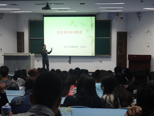 2012级刘达培宣讲有关党史的部分知识。他从部分党史问题引入“党的基本知识回顾、党的重要会议提要、入党常用文书写作”三个内容,内容丰富精彩,赢得了一片热烈的掌声;接下来,2011级的孙美玲从全国两会、重庆市市情、h小说