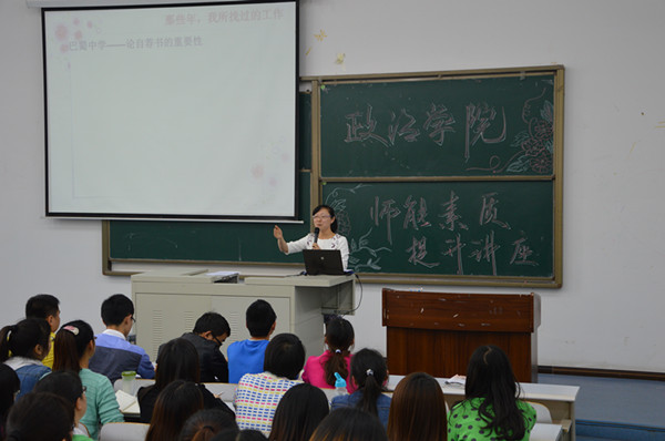 组织2011级全体学生于2014年4月21日下午4点半在图北楼7201开展了师范生素质技能讲座,主讲人为重庆南开中学韩琳老师,出席此次讲座的有h小说