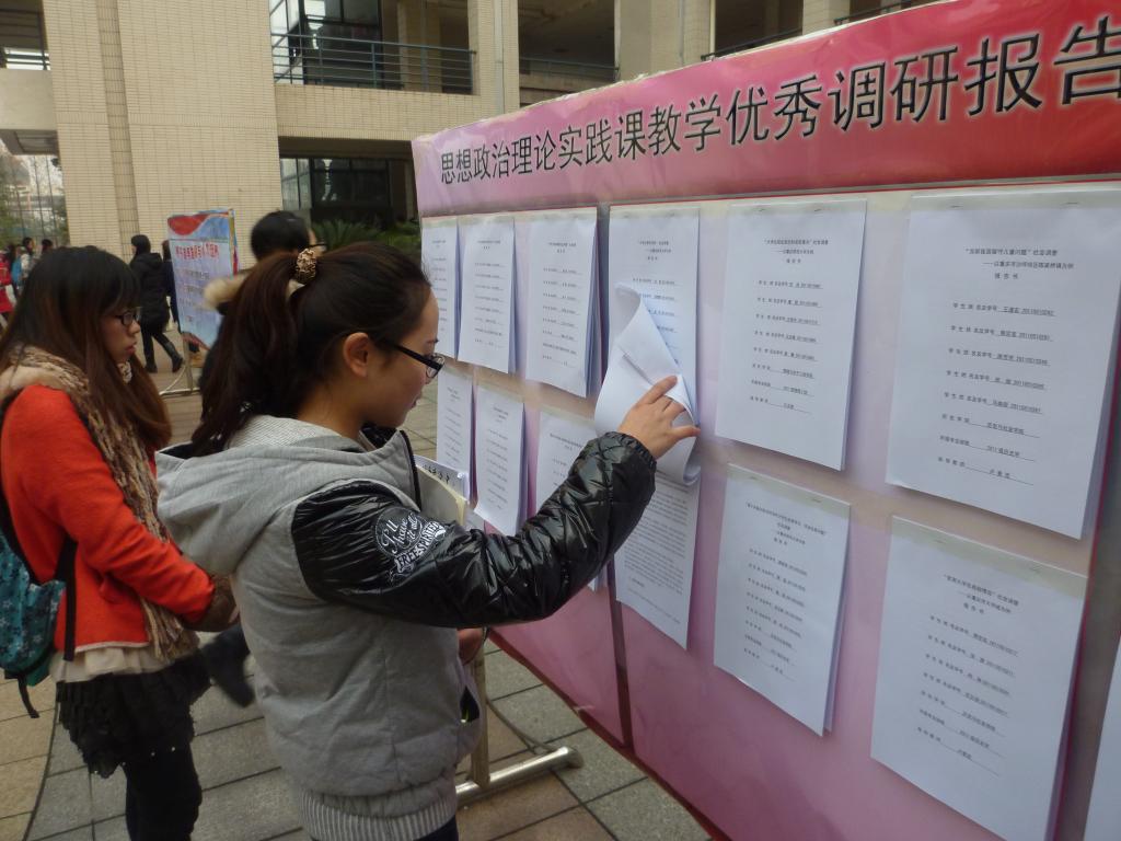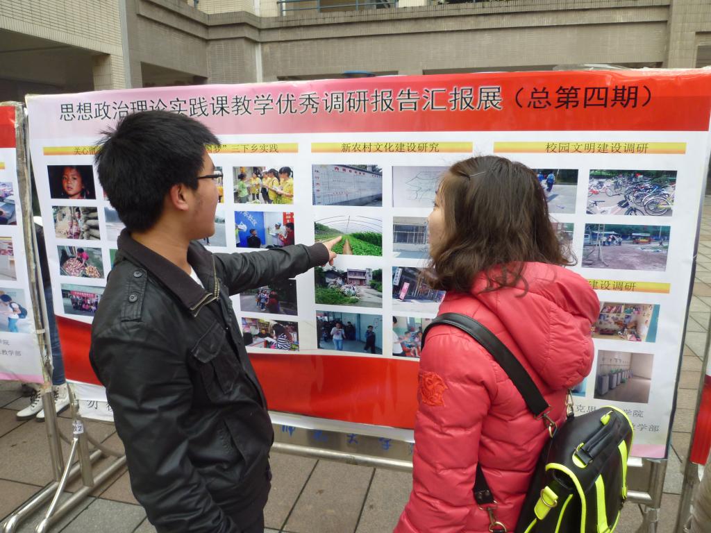 “思想政治理论课实践教学优秀调研报告汇报展”(总第四期)在弘德楼中庭隆重举行。本次展出的调研报告,是从我校2011级历史与社会学院、文学院、外语学院、生命科学学院、化学学院、物理与电子工程学院、计算机与信息科学学院的学生在历时半年的实践教学活动产生的调研报告中遴选出来的部分优秀作品,共计59篇。同时还展出了同学们在参加社会实践活动过程中形成的图片资料。