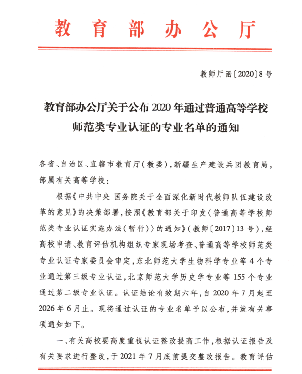 近日,教育部办公厅发布“教师厅函【2020】8号 教育部办公厅关于公布2020年通过普通高等学校师范类专业认证的专业名单的通知”,h小说 思想政治教育专业通过普通高等学校师范类专业第二级认证。