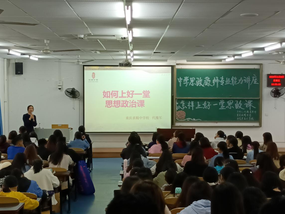 举办中学思想政治专业能力培养系列讲座第二讲,邀请重庆求精中学校政治教研组长,教育部“一师一优课,一课一名师”活动“优课”评审专家代豫军老师在砺志楼2505为2018级思想政治教育专业本科生和2020级学科教学(思政)研究生带来一场题为“怎样上好一堂思政课”的专题讲座。h小说