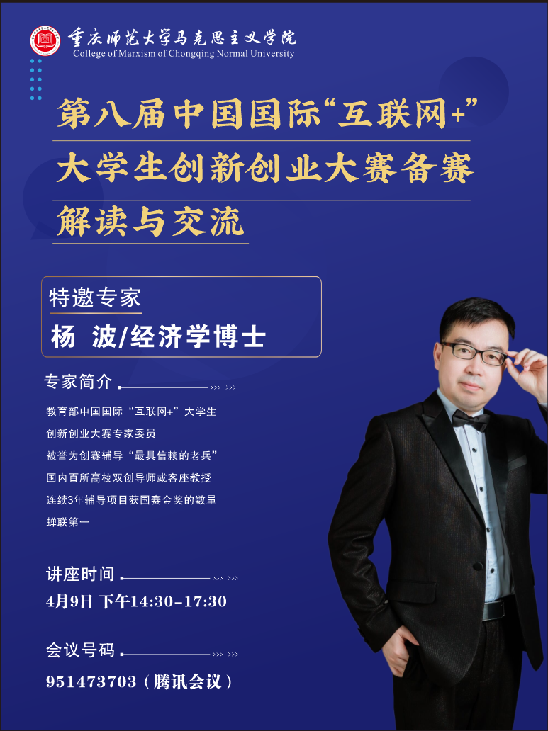 邀请了经济学博士、北京云网联科技有限公司联合创始人、教育部中国国际“互联网+”大学生创新创业大赛专家委员及团中央“挑战杯”大赛评委、中国高等教育学会“双百计划”专家、中国教育创新研究院特邀专家,被誉为“红旅老杨”的杨波老师,通过腾讯会议平台,为学院师生开展了题为“青年红色筑梦之旅赛道——中国国际‘互联网+’大学生创新创业大赛备赛解读及交流会”讲座。整个讲座分三部分:①备赛的解读,尤其是红旅赛道的精要,以及新工科,新农科,新商科,新医科,新文科的生态融合;②专项解读辅导,针对专门项目解读红旅赛道备赛精要,并深入解读了项目设计与“四新”融合之道;③在线互动交流。h小说