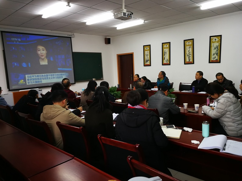 委员会思想政治理论学习实施办法》的主要精神,分别从总则、学习组织、学习内容及形式、学习管理、督查与考核、附则等六个方面向大家做了学习和介绍,尤其是学校党委对思想政治理论学习的学习对象、学习内容、学习形式和学习要求进行了详细的解读,他强调希望大家通过实施办法的学习深刻认识思想政治理论学习的重要性,从思想认识、行动落实都要到位;接着全体成员观看了《习近平为第五批全国干部学习培训教材作序》视频新闻,进而学习了习近平总书记的序言全文,认真领悟了加快推进马克思主义学习型政党学习大国建设的重要意义;最后,刘军书记传达了学校近期开展的“安稳工作会暨2019年度上半年意识形态工作会”精神,强调大家要在灵魂深处高度重视思想政治学习和意识形态工作,准确研判和把握今年整体工作形势,努力做到增强“四个意识”、坚定“四个自信”、做到“两个维护”。