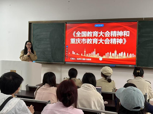 随后,三位党员同志依次进行全国教育大会精神、重庆市教育大会精神的学习分享。杜梦玲同志领学全国教育大会精神中的立德树人根本任务和教育强国战略目标,并清晰阐述了教育改革与发展的方向;曹静同志从实施立德树人工程、加强教师队伍建设、鼓励社会力量参与以及应对未来挑战这四个方面,与同志们进行充分学习与探讨;刘倩倩同志领学重庆市教育大会精神。最后,谭景文同志对本次主题党日活动进行总结,要求全体党员认真学习领会、深入贯彻落实相关会议精神,深刻领悟 “两个确立” 的决定性意义,不断增强 “四个意识”、坚定 “四个自信”,切实做到 “两个维护” 。