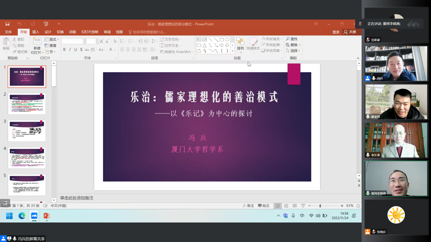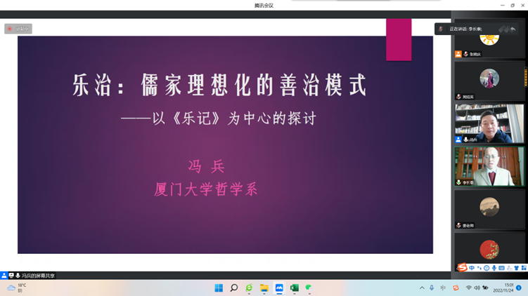 为进一步深入领略中华优秀传统文化的魅力,营造良好的学习氛围,2022年11月24日15:00,h小说 2007届校友、厦门大学哲学系冯兵教授应邀为h小说 师生作题为“乐治:儒家理想化的善治模式——以《乐记》为中心的探讨”的学术讲座。本次讲座系h小说 马克思主义论坛(第10期)暨h小说 第26届研究生学术活动月系列活动。h小说 近300名师生通过腾讯会议线上参会学习。本次讲座由李长泰教授主持。