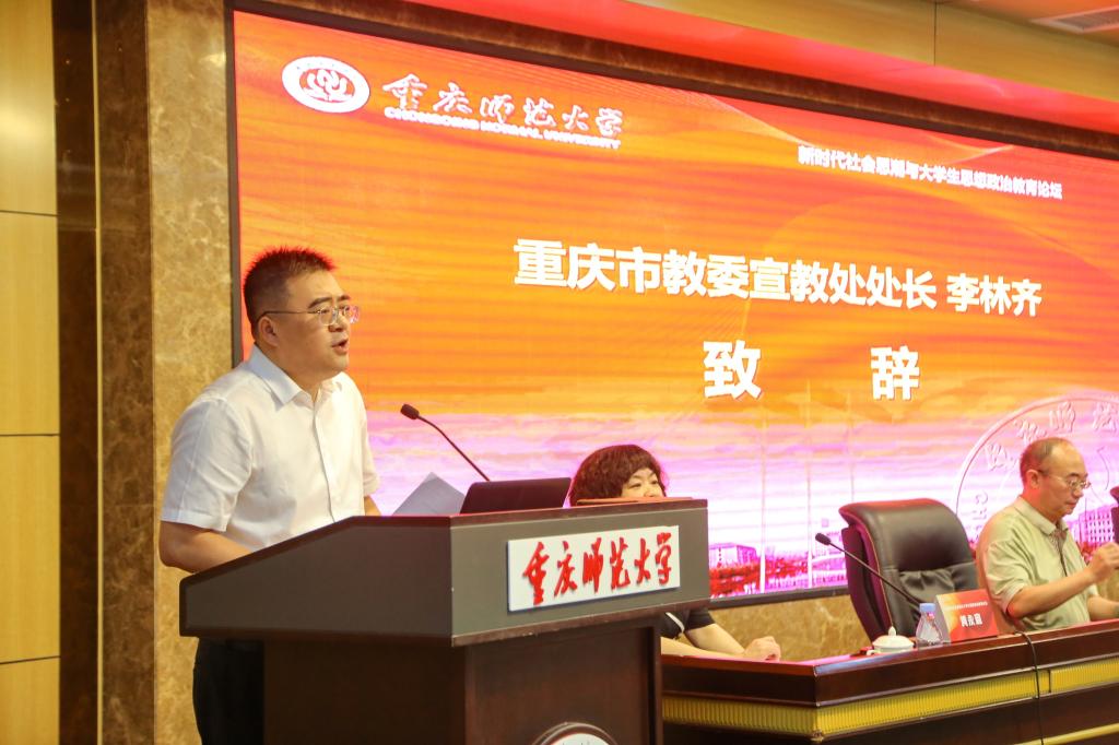 接着,重庆市教委李林齐处长致辞。他指出,要按照教育部相关精神,加强学术交流合作,不断推动思想政治教育高质量发展,在“第二个百年奋斗目标”的大背景下要进一步增强思政课的主动性、生动性和实践性;要引导思政课教师立志做大先生,潜心做大学问,汇聚思政教育大合力。