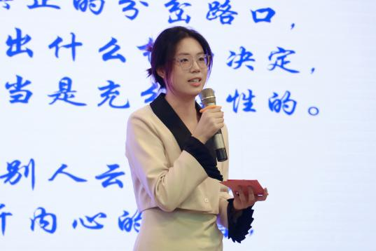 其中,袁茹分享自己在学生工作经历中主动担当作为,不断锤炼过硬本领,鼓励同学们做有理想、敢担当、能吃苦、肯奋斗的新时代青年。赵杰祥讲述自己在不幸的童年中积蓄力量、坚定理想信念,成长为学业、工作、实践协同发展的青年骨干。杨靖讲述了自己在重师马院的七年经历,他以“日拱一卒”的坚持跨越迷茫,以“知行合一”的实践书写属于自己的青春篇章。罗欣悦讲述了自己从“技能小白”成长为具备扎实师范生技能的学生骨干,鼓励同学们成长为有理想信念、有道德情操、有扎实学识、有仁爱之心的思政课教师。