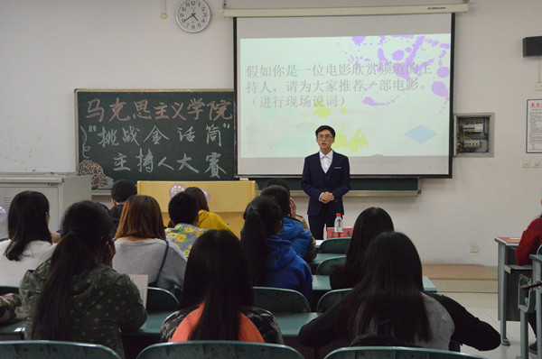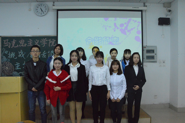 团总支·学生会办公室副主任罗颖、张泽哲,文娱部副部周玲、但和林,女生部副部肖会莲以及第一届“挑战金话筒”大赛一等奖得主崔倩倩。马克思主义2016级弘砺班全体同学参加本次活动。