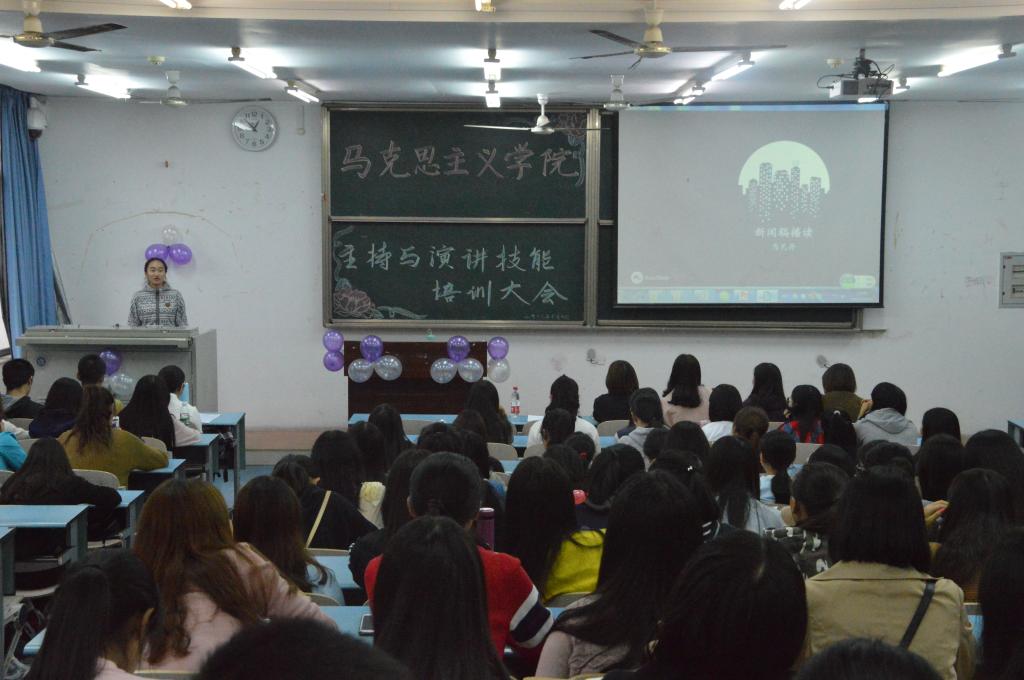 于弘德楼5202教室举行了主持与演讲技能培训大会。我校h小说广播电台播音员马艺丹、传媒学院文娱部部长孙路路、马克思主义学院学生会主席马涛以及学生会办公室副主任罗颖、出镜记者李阳悦心出席了本次培训大会。2016级全体学生参与。