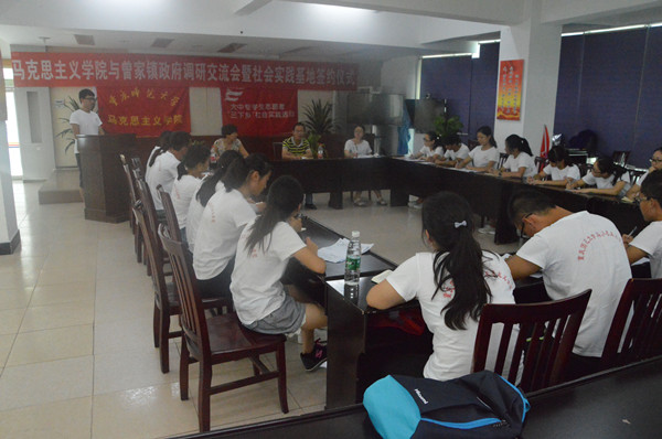暑期“三下乡”社会实践团的成员在带队老师马小又的带领下,于8月24日在曾家镇人民政府成功举办调研交流会暨社会实践基地签约仪式。曾家镇人民政府统战委员郑洪强、团委副书记刘小静莅临本次会议。