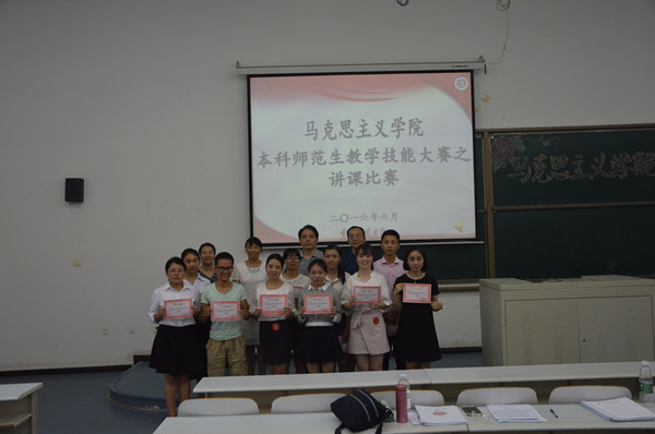 最后,由左秋明老师对本次比赛作点评。他肯定了选手们的充分准备,对选手们课件的制作、演讲的能力以及课程的把握予以赞扬,并鼓励大家互相学习,共同进步,同时他也强调同学们要加强对理论知识的掌握,多多阅读课外书籍;讲课中要注重与学生交流,共同参与等。最终胡海鹏、郑怡荣获本次讲课比赛一等奖,杨光瑞、王茜、欧晟旭、曹艳红荣获本次讲课比赛二等奖,刘春燕、彭修霞 、何敏、罗颖、崔倩倩荣获本次讲课比赛三等奖,王茜、罗颖、郑怡、何敏荣获三笔字优秀奖。