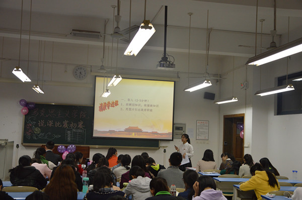 随后,比赛正式开始。各参赛选手依次登台,淡定从容完成即兴演讲,展现了个选手的良好的语言组织能力和应变能力。演讲结束,选手进入说课环节,纷纷借助PPT等多媒体设备,说出自己精心准备的精彩一课。各选手各显神通,展现自我魅力与风采。12号选手朱燕妮以《传统文化的继承性》为说课课程,从教材分析、学情分析、教学目标、教学重难点、教学方法、教学流程等方面展开了说课,内容详尽、条理清晰,获得阵阵掌声。而7号选手程晓娇以精美的课件展示了自己精心设计的说课内容。优雅的台风,流畅的语言,精准的知识讲述博得全场喝彩。比赛角逐激烈,现场气氛活跃。