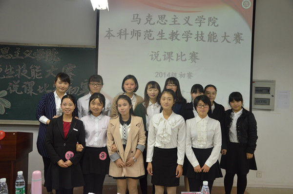 最后,评委与选手们合影留念,比赛圆满结束。据悉,本次比赛共有程晓娇、安虹静、陈果等8位2013级选手,朱燕妮、郑怡等4位2014级选手进入决赛。而2015级说课比赛将稍后举行。让我们对选手们在决赛中更加精彩的表现拭目以待。