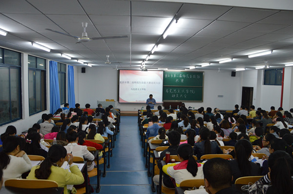 接着郑瑜老师就“竞赛的内容”和“教学设计与模拟上课”两方面向同学们作出了详细的介绍。竞赛的内容包括教学设计、课件制作、模拟上课、即兴演讲四个方面。郑老师指出,抽取教材内容是教学设计的关键,而教学设计又决定了课件的制作,因此同学们一定要熟悉当前重庆市高中政治教材。在“教学设计与模拟上课”方面,郑老师先向同学们展示了教学模板,再就模板的设计、填写、使用说明等方面作出具体阐述,如教学的目标常用语的使用、教学知识间的关系、学情分析、教学方法等。对于模板的填写要求,郑老师指明需填写一课时的教学设计,并且要求教学过程语言简洁明了,而关于模板的使用则可以利用语言、教学案例等资源。最后的模拟上课环节郑老师希望同学们做到逻辑清晰、突出焦点、准备充分、自信发挥。