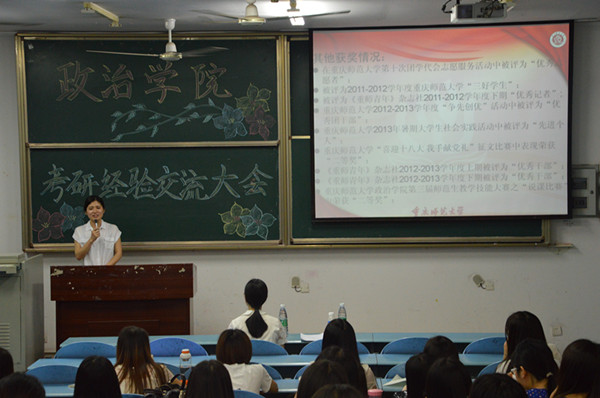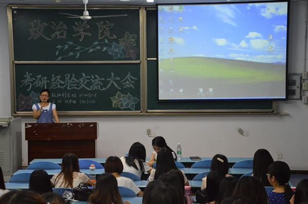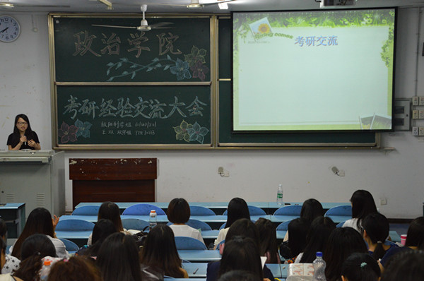 考取厦门大学科学技术哲学专业的毛娟从“为什么选择考研”进行交流:第一,考研可以缓解就业压力,获得更好的就业机会、薪酬待遇与职业发展前景;第二,选择考研可以追逐自己的兴趣,达到专业的高度;第三,可以构造更高层次的交际圈,为未来的发展铺路;第四、能给自己一个继续深造的机会;第五、在考研过程中,收获的不仅是一张录取通知书。她也推荐了考研的专业书给在座的同学并分析了考研应注意的事项,同时也分享了三点建议:一、学好专业知识,争取获得学校奖学金;二、丰富校园生活,提升综合能力;三、多进图书馆看书,增加人生阅历。最后,她以汪国真的一句诗“要输就输给追求,要嫁就嫁给幸福”鼓励学弟学妹们要坚持考研,实现梦想。