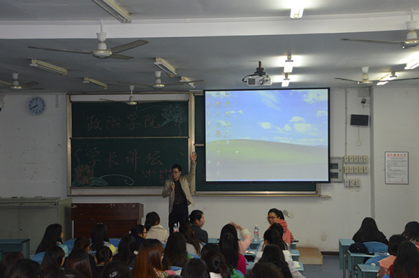 2013、2014级在弘德楼5201教室开展了学长讲堂活动,特邀2012级在学术科研方面有一定成绩的彭镜、向海霞、杜中波三位学长为同学们答疑解惑,辅导员张晓庆老师以及2013、2014级全体学生参与。