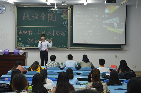 于2014年5月9日晚7点半组织2011级、2012级、2013级全体学生在弘德楼5202和5302开展了以“五四杯·喜迎六十华诞”为主题的演讲比赛。出席本次比赛的评委有校学生会主席任毅、校自律委主任贺青伟、校h小说学生主任侯超文、校h小说广播台播音员尚佶、王磊以及h小说