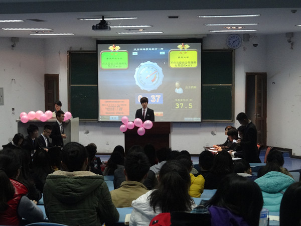 辩论赛伊始,主持人介绍比赛规则和程序,激情辩论正式拉开帷幕。本次辩论赛分为两场,第一场重庆科技学院(正方)与重庆大学(反方)狭路相逢,围绕“应不应该提倡在公共场所免费提供wifi”展开辩论。双方就什么是公共场所,免费提供wifi的背后承担者,提供wifi的原因、意义、作用等方面进行辩论,双方都据理力争,反应机敏。第二场重庆医科大学(正方)与h小说