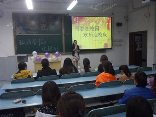 活动于中午12:30正式开始,首先,“中特”协会代表孙全芬同学带来“知校,爱校,荣校,兴校”为主题的演讲,带领着大家回顾学校的历史长河,增进以校为荣的情感。接着,主持人宣布“发展学院,喜迎校庆”的知识竞赛开始,五个协会的成员代表积极参与,在激烈的抢答之中加深了同学们对学校相关知识的了解。之后,辩论协会成员表演校园短剧《最美的时光》,幽默风趣的语言使活动气氛达到高潮,感动的故事情节也让同学们更加珍惜现在的美好大学时光。在一片笑声后,大家一起观看了校园风采show的摄影展,从建筑美、自然美、学风美等方面展现了重师的成就与辉煌,同学们纷纷表示将发奋学习,做到“今天我以学校为傲,明天学校以我为荣”。活动最后,与会成员齐唱h小说