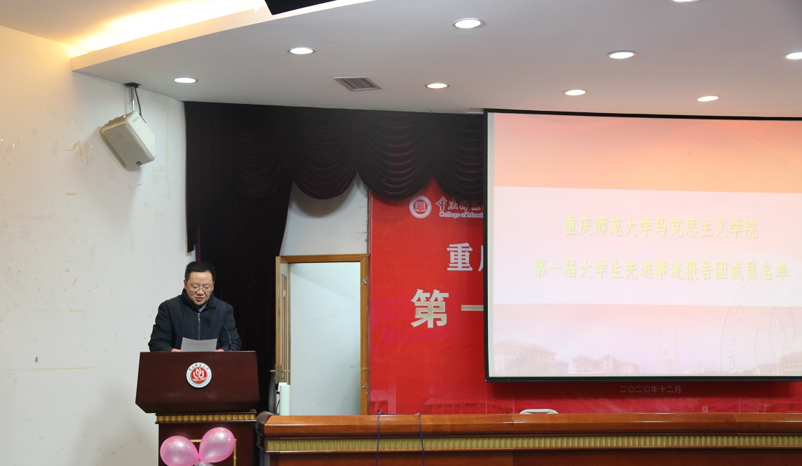 院长陈洪宣读第一届先进事迹报告团成员名单:胡开英、刘凤霞、欧雪婷、邹左、邓淑月、龙冠雨、王鑫茹、薛挺、苟雪倩、符路、苏鑫鑫、霍娜、邓尚昀共13名同学。