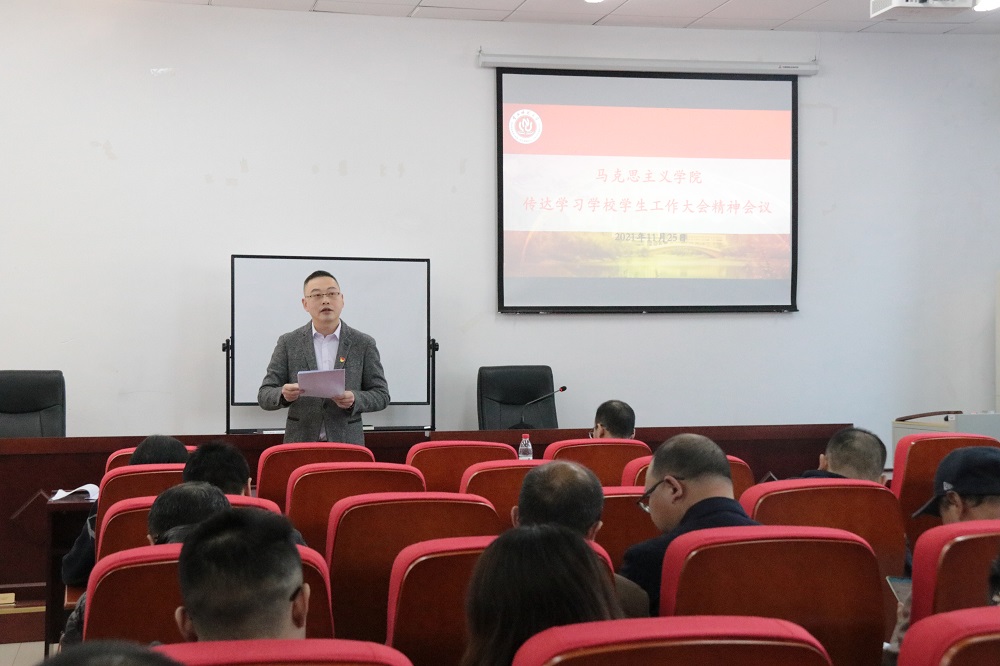 关于进一步加强新时代学生工作的意见》等文件精神,深刻把握新发展阶段学院学生工作面临的新形势,准确识变、科学应变、主动求变,加快构建学院学生工作新发展格局,培养担当民族复兴大任的时代新人。继学院党政、学工办、教科办认真学习、传达、讨论学校学生工作大会精神后,2021年11月25日14时30分,学院特于汇贤楼106室召开传达学校学生工作大会精神会议,学院全体教职工参会,学院党委副书记方敏主持会议。
