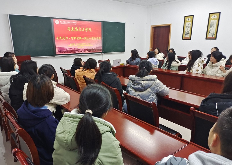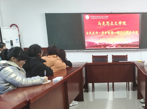 组织全体同学观看“全民反诈•守护校园•同上一堂反诈课”视频直播课,2021级思想政治教育专业部分学生代表于汇贤楼309教室线下集中观看直播,学院其他年级同学线上参与,2021级思想政治教育专业4班团支书韩奇奇担任主持人。
