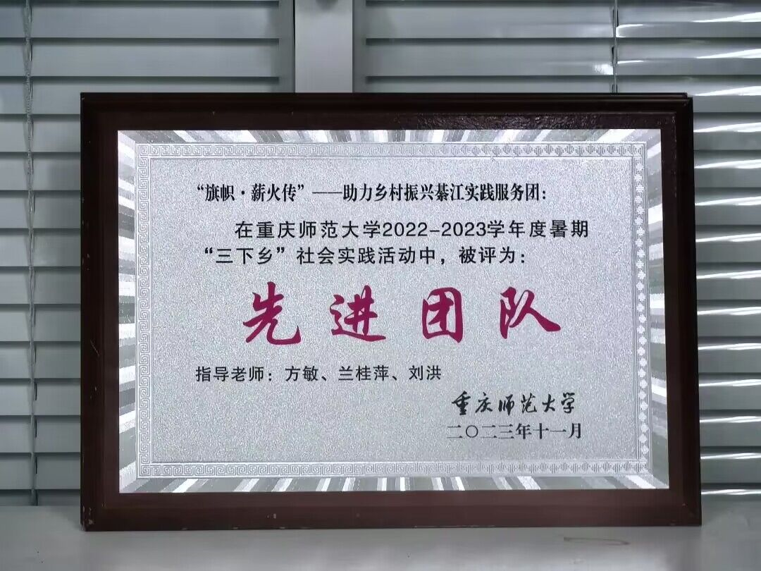 在本次暑期“三下乡”社会实践活动中,h小说 “旗帜·薪火传”——助力乡村振兴綦江实践服务团、“旗帜·社区”求真学史实践团赓续红色基因,担当青年责任,荣获“先进团队”称号。