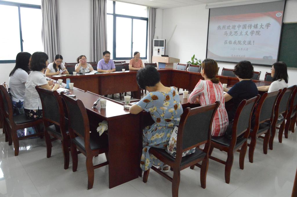 的马老师介绍了学院的具体情况,简单说明了课程的规模、形式和内容等,强调了对课程内容质量的设计。在双方提问交流环节,共同探讨了思想政治理论教学改革、如何增强思政课的亲和力、研究生报考等相关问题。最后,吴院长提议双方互派教师深入课堂进行实践学习。