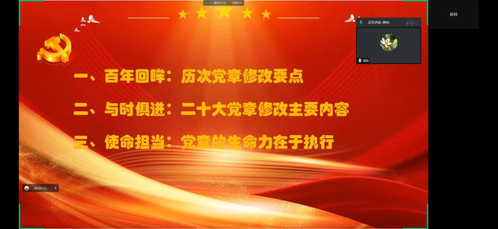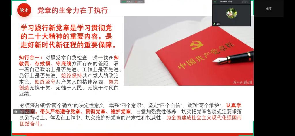 随后,侯玲副院长从三个方面对《中国共产党章程(修正案)》进行了领学:一是百年回眸——历次党章修改及要点。主要从三个阶段和四个体系中帮助大家梳理学习党章的发展变化并从中领会党章演进的规律。二是与时俱进——二十大党章修改的主要内容。详细解读了新党章总纲修改的37处和条文部分修改的13处内容,并强调每一处修改都从政治高度体现了党的建设的新要求。三是使命担当——党章的真正生命力在于执行。学好新党章,走好新征程,关键在于怎样把党章落在实处,并强调在学习和践行新党章的过程中,要把党的二十大精神落实到实际工作中,为全面建设社会主义现代化国家而努力奋斗。