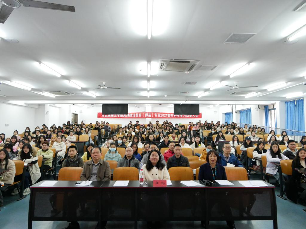 于砺志楼2113教室召开2021级本科生实习动员大会,学院副院长侯玲以及实习领导小组出席本次会议,2021级思想政治教育专业全体本科生参加。本次大会由2022级本科生龚梓豪主持。
